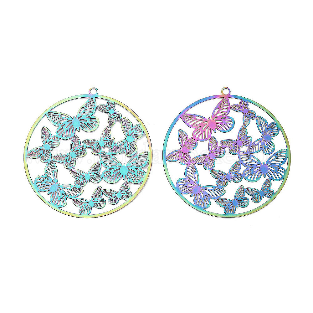 • Rainbow Color 201 подвески из травленого металла из нержавеющей стали, плоский круглый с подвеской в виде бабочки, Радуга цветов, 47x44x0.2 мм, отверстие : 2 мм
