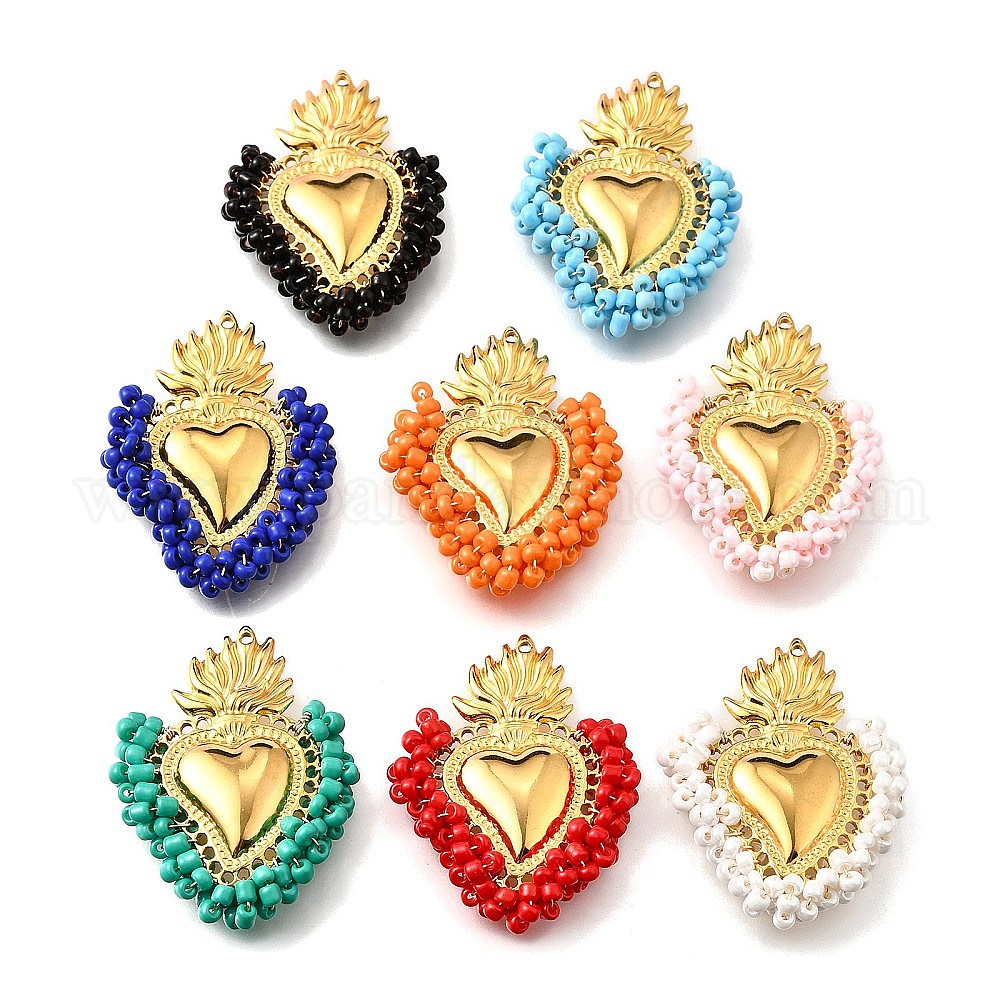 • Коралловый 304 подвески из нержавеющей стали, со стеклянными бисеринами, очарование священного сердца, реальный 18 k позолоченный, коралл, 44~44.5x34~35x7 мм, отверстие : 1.2 мм