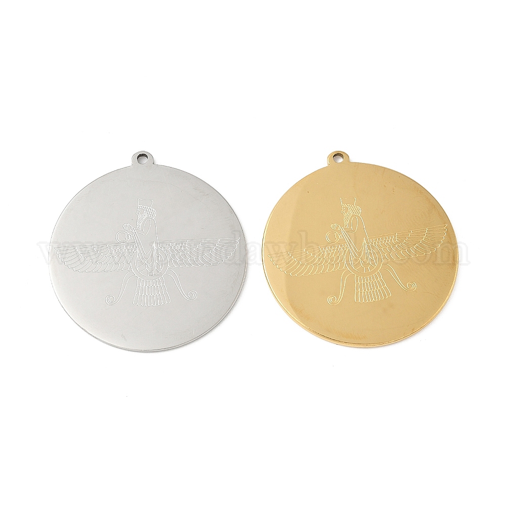 • Нержавеющая Сталь Цвет 304 подвески из нержавеющей стали, плоский круг с узором фаравахара, цвет нержавеющей стали, 37.5x34.5x1.5 мм, отверстие : 1.5 мм