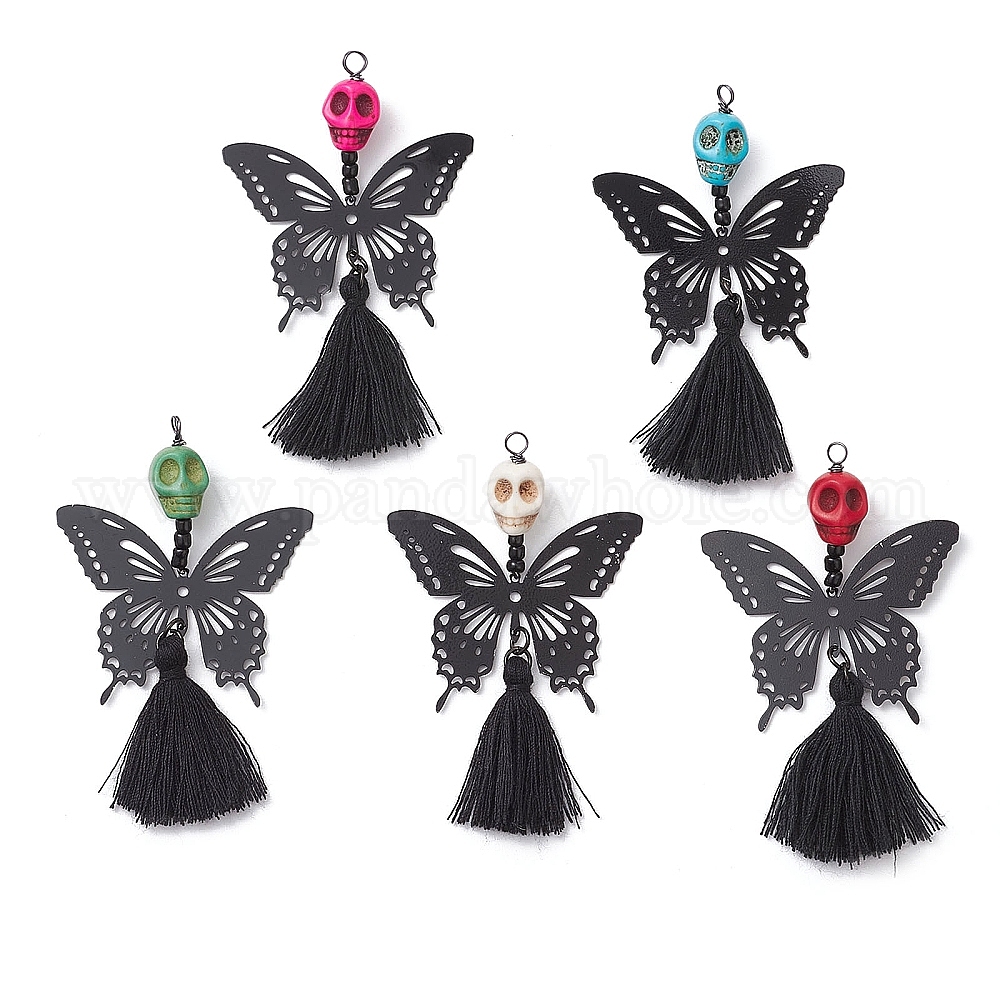 304 подвески из нержавеющей стали, бабочка с черепом, с синтетическими бирюзовый, кисточка из поликоттона (полиэстер хлопок) ручной работы и стекло