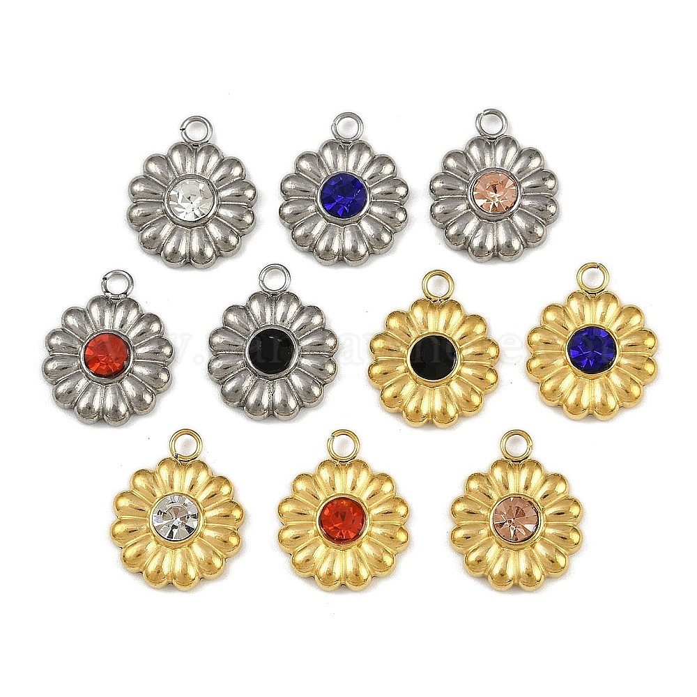 • Кристалл 304 прелести нержавеющей стали, со стразами, цветочный шарм, реальный 18 k позолоченный, ионное покрытие (ip), кристалл, 14.5x11.5x3.5 мм, отверстие : 1.8 мм