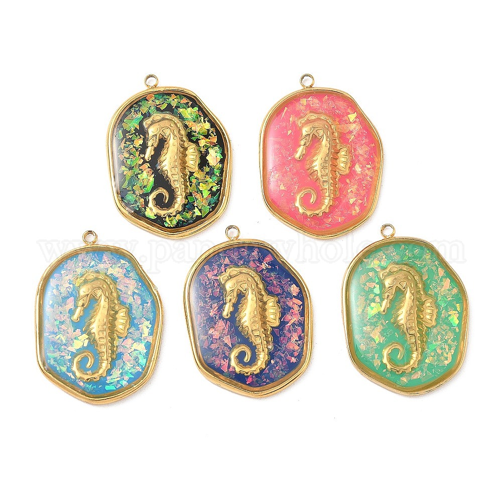 304 подвески из нержавеющей стали, эпоксидной смолы, с натуральными ракушками и пайетками внутри, овал с подвесками в виде морского конька, реальный 18 k позолоченный, вакуумное покрытие pvd (036APS)