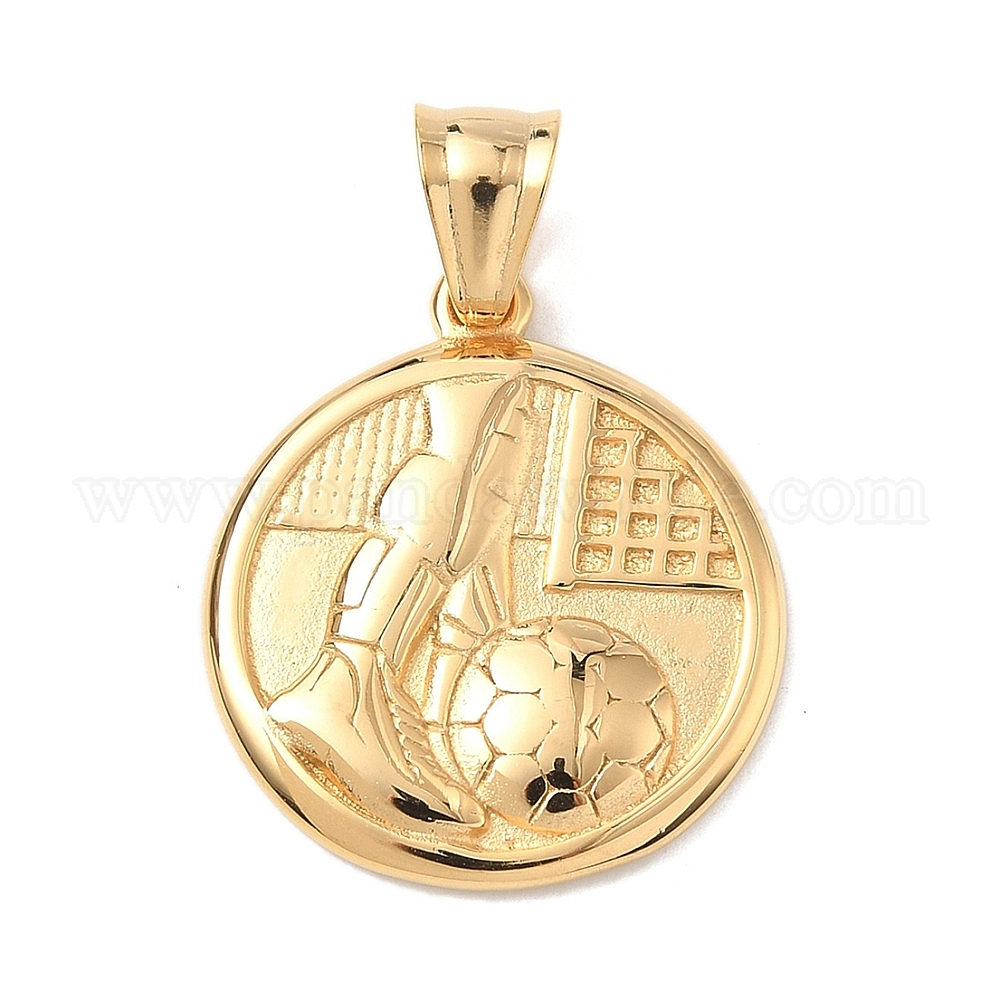 • Настоящее золото 18K Спортивные 304 подвески из нержавеющей стали, плоские круглые с футболом, ручная полировка, ионное покрытие (ip), реальный 18 k позолоченный, 29.5x25.5x3 мм, отверстие : 5x8 мм