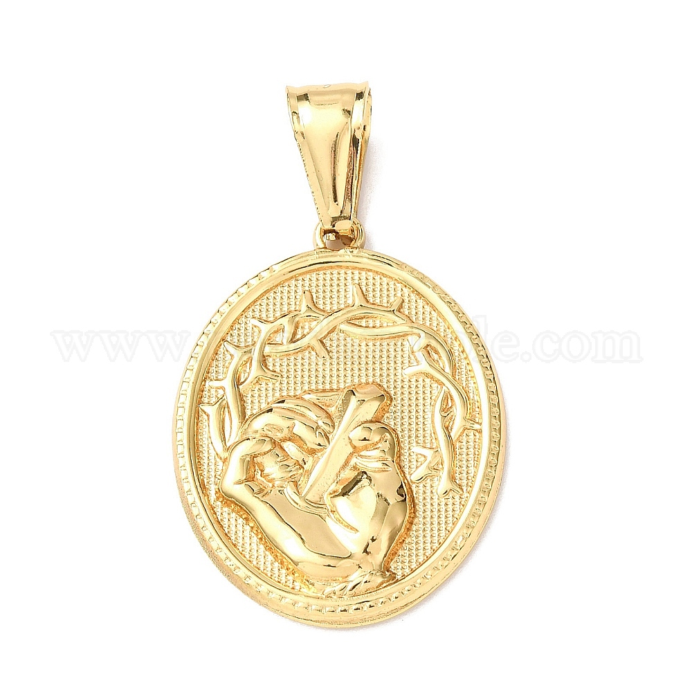• Настоящее золото 18K Пасхальные 304 кулоны из нержавеющей стали, овальный шар с подвеской в виде тернового венца и пальмовой ветви., ионное покрытие (ip), реальный 18 k позолоченный, 36.5x27.5x4 мм, отверстие : 12x5 мм