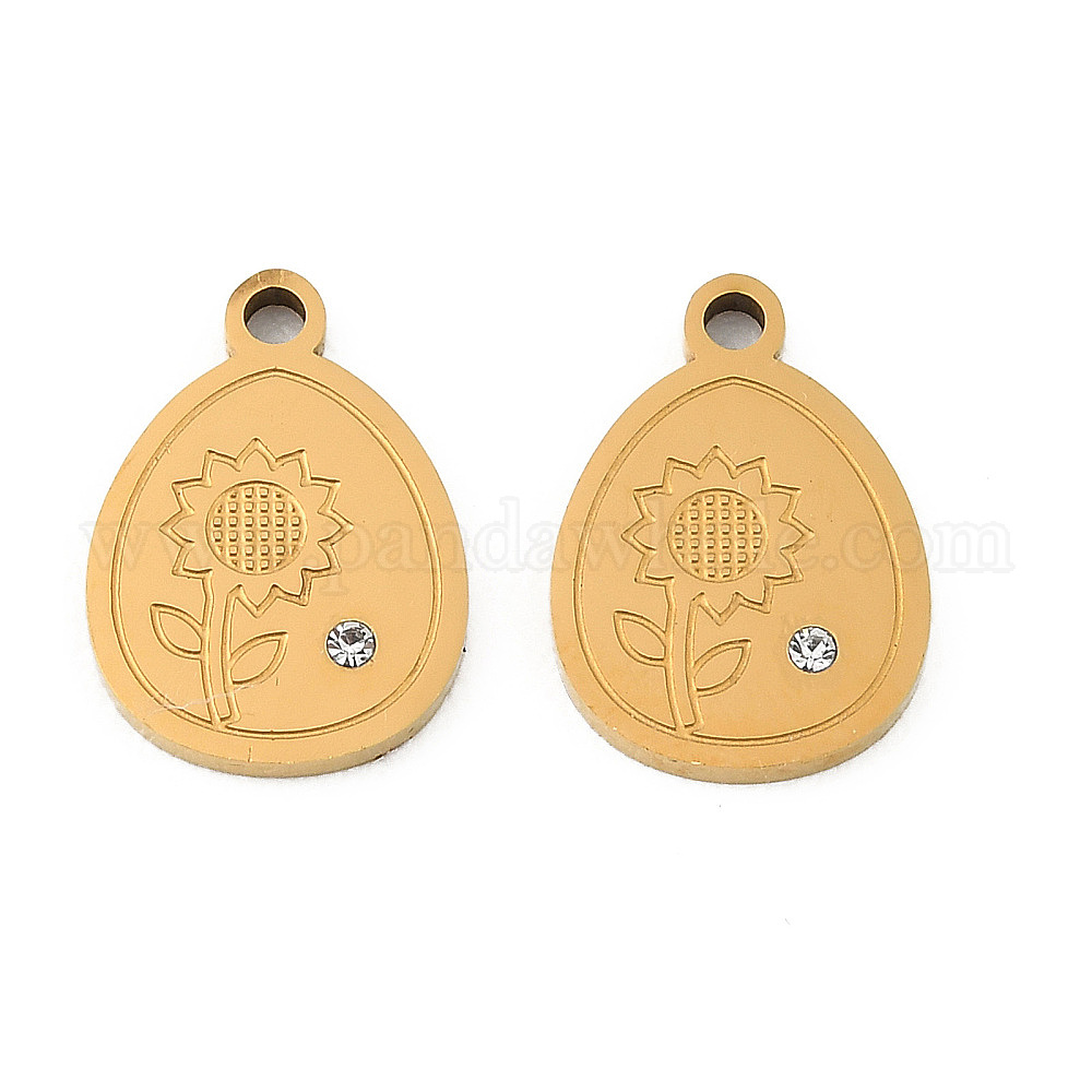• Золотой 304 подвески из нержавеющей стали, яйцо с подвеской в виде подсолнуха, со стеклянными стразами, золотые, 15.5x11x1.7 мм, отверстие : 1.4 мм