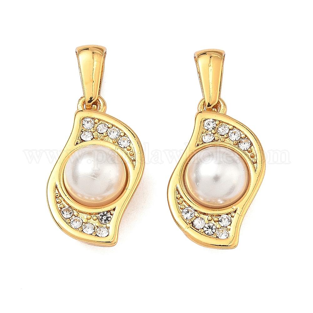 • Золотой 304 подвески из нержавеющей стали с микропаве из стразов, амулет в виде неправильного листа, с абс пластмассовой имитационной жемчужиной, золотые, 22x12.5x9 мм, отверстие : 7x3 мм