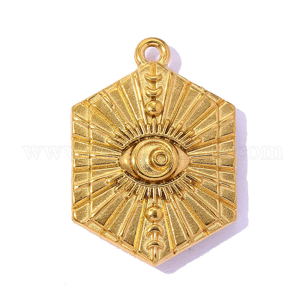 • Настоящее золото 18K 304 подвески из нержавеющей стали, шестиугольник с амулетом от сглаза, ионное покрытие (ip), долговечный, реальный 18 k позолоченный, 20x14 мм, отверстие: 1.30 мм