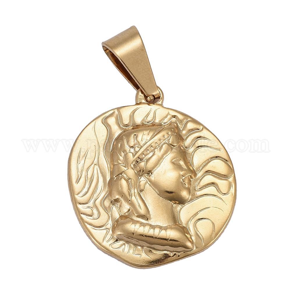 • Золотой Ионное покрытие (ip) 304 подвески из нержавеющей стали, плоские круглые с девственницей, золотые, 25x22x2.5 мм, отверстие : 9x4.5 мм