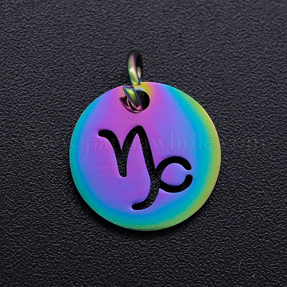 Радужное ионное покрытие (ip) 201 подвески из нержавеющей стали, с прыжковых колец, плоский круглый с созвездием / знак зодиака