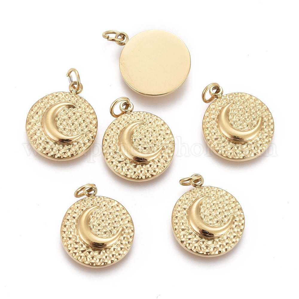 • Золотой Ионное покрытие (ip) 316 хирургические брелоки из нержавеющей стали, с целью перехода в кольце, плоские круглые с луной, золотые, 14.5x12x2.5 мм, отверстие : 2.8 мм