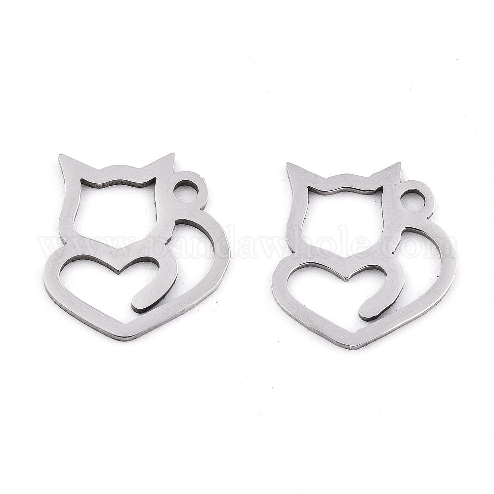 • Нержавеющая Сталь Цвет Не тускнеющие 201 подвески из нержавеющей стали, лазерная резка, кошка с сердцем, цвет нержавеющей стали, 13x12x0.9 мм, отверстие : 1.5 мм
