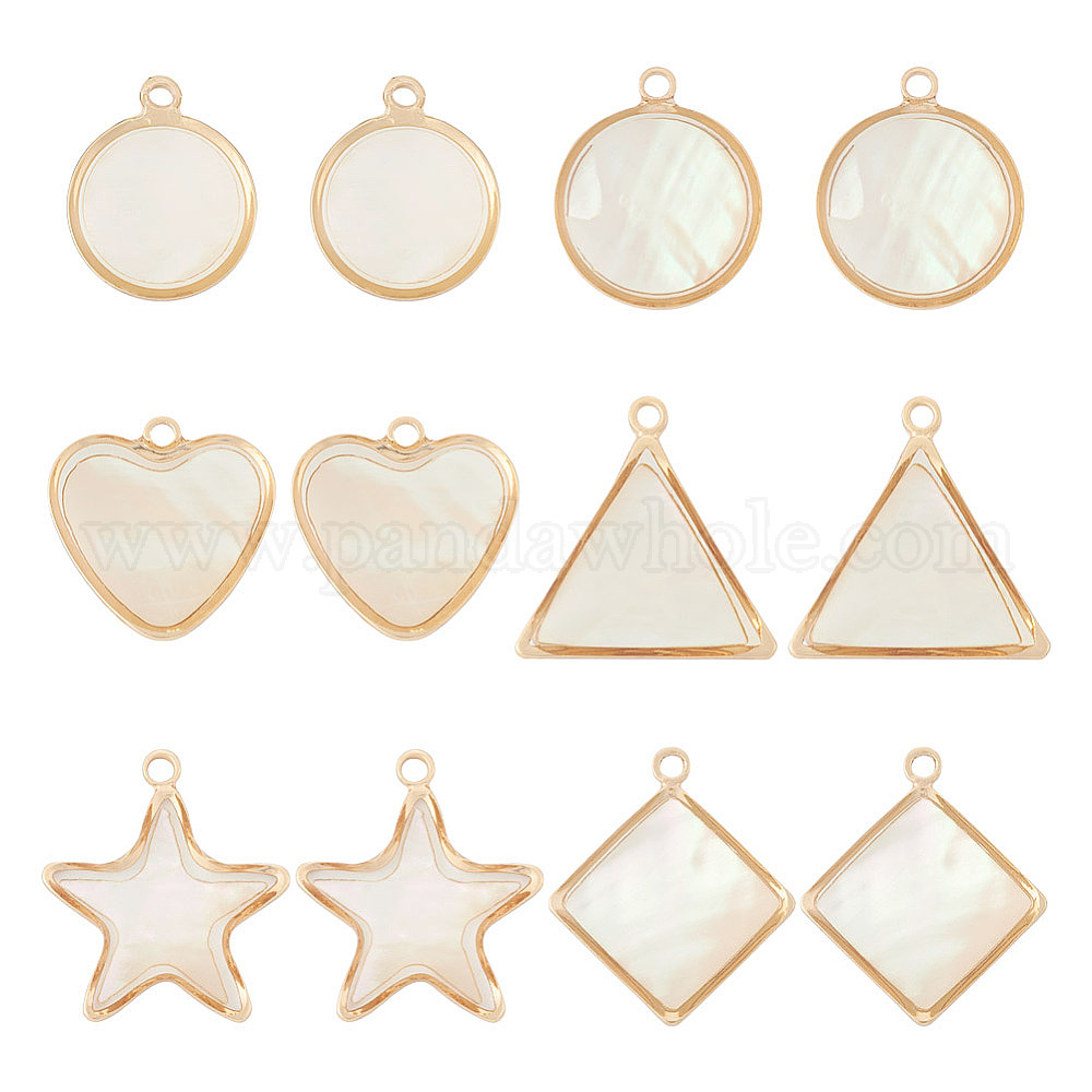 12шт 6 стили подвески из натуральных ракушек, геометрические прелести, с золотистым сплавом и латунной фурнитурой, плоский круглый и звезда и ромб, разнообразные