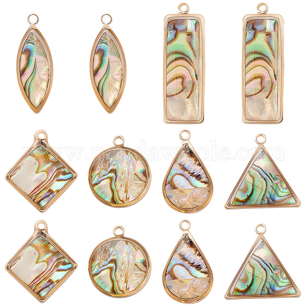 12шт 6 стили подвески из натуральной ракушки пауа, с фурнитурой позолоченной латунной, разнообразные