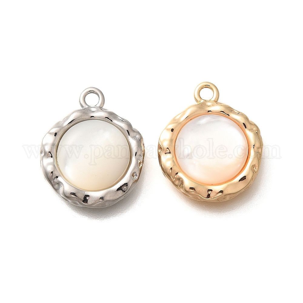 Подвески из латуни с натуральными белыми ракушками, текстурированные плоские круглые подвески