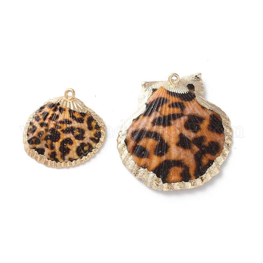 Подвески натурального морских раковин, с латунной отделкой краев, подвески в форме ракушки с леопардовым принтом