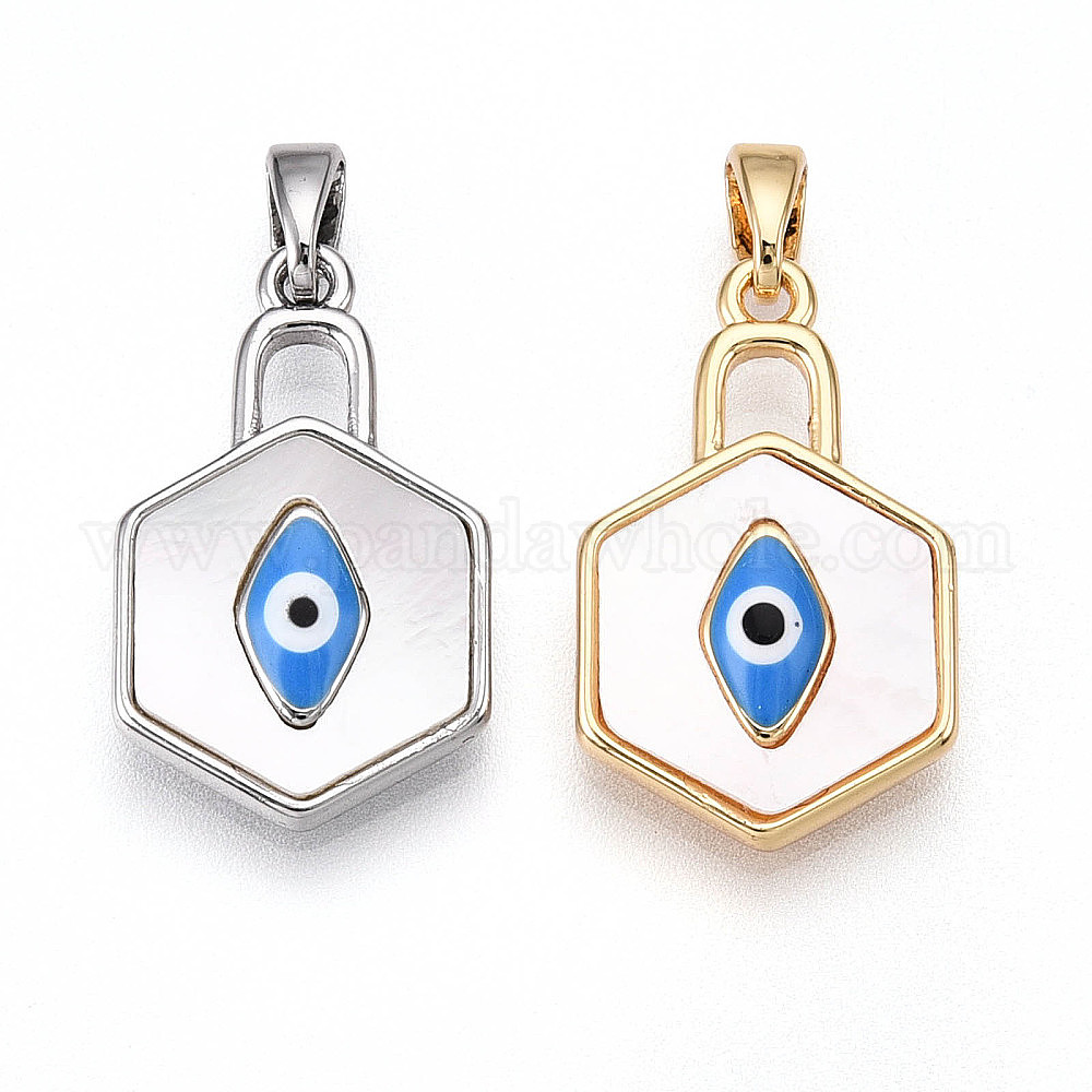 • Платина Подвески из натуральной ракушки в форме шестиугольника из латуни, очаровашка синяя эмаль сглаза, платина, 21x13x3.5 мм, отверстие : 5x2 мм