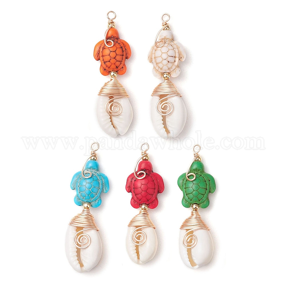 Синтетическая бирюзовая бусина с натуральными смешанными бусинами из ракушек каури и подвесками из экологически чистой медной проволоки и латунных бусин, черепаха (032NQE)