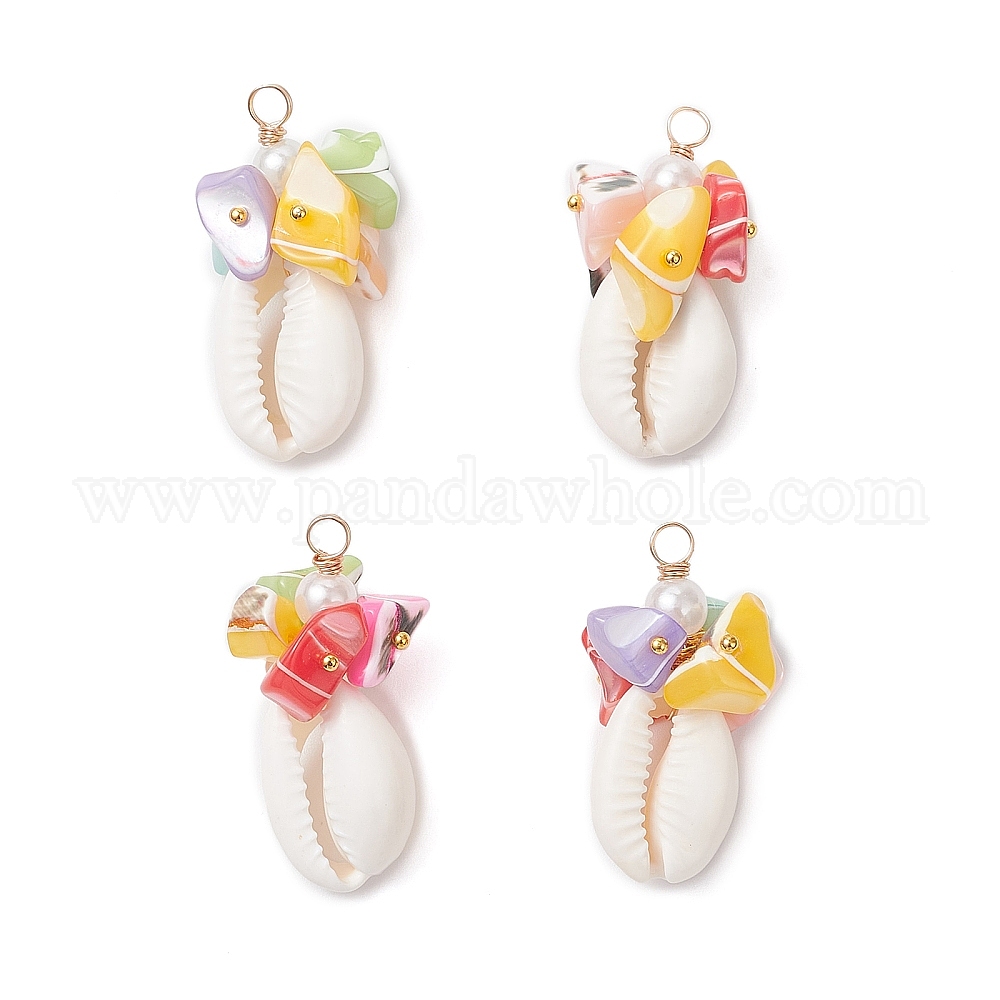 • Золотой Подвески из натуральных ракушек каури и окрашенных натуральных ракушек трохид, подвески в форме ракушки с медной проволокой, обернутой в искусственный жемчуг, разноцветные, золотые, 34.5~36.5x17.5~18.5x15.5~18.5 мм, отверстие : 3.5 мм