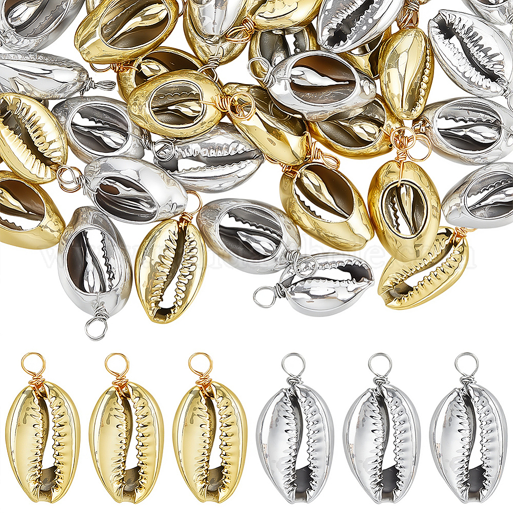 60 шт. 2 цвета гальванизированные подвески из натуральной ракушки каури, Подвески в форме ракушки с петлями из медной проволоки