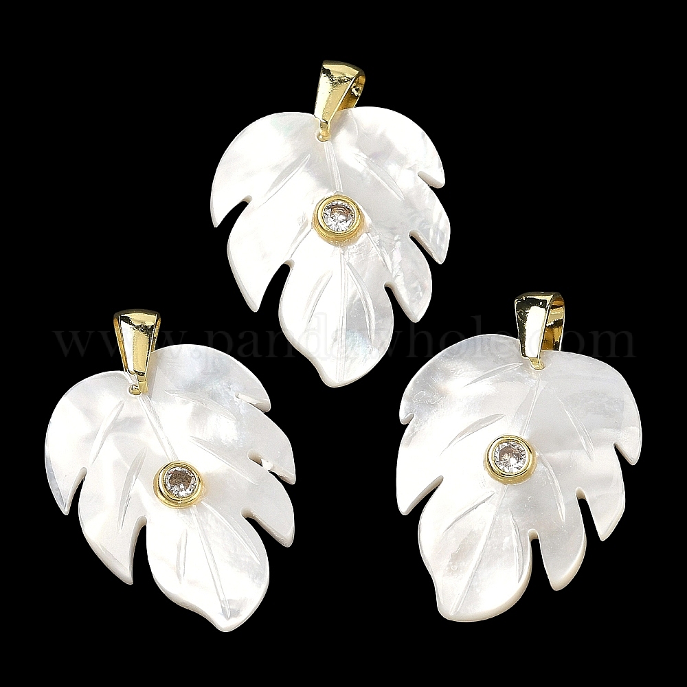 Резные подвески из натуральных белых ракушек, Подвески в виде листьев с латунной инкрустацией из прозрачных кубических цирконий., золотые