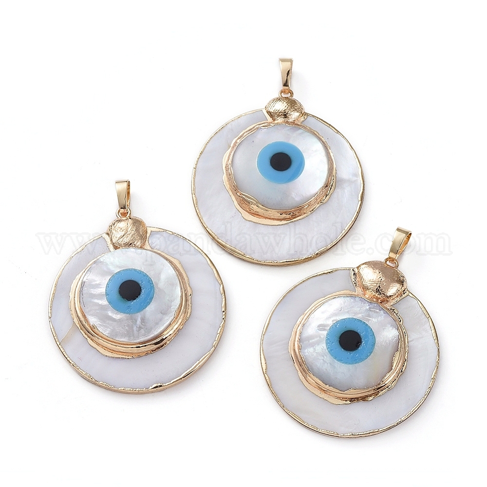 • Золотой Гальванические подвески, с латунной фурнитурой , Плоский круглый и глазный, белые, 45.1x40x7.9 мм, отверстие : 8x5 мм