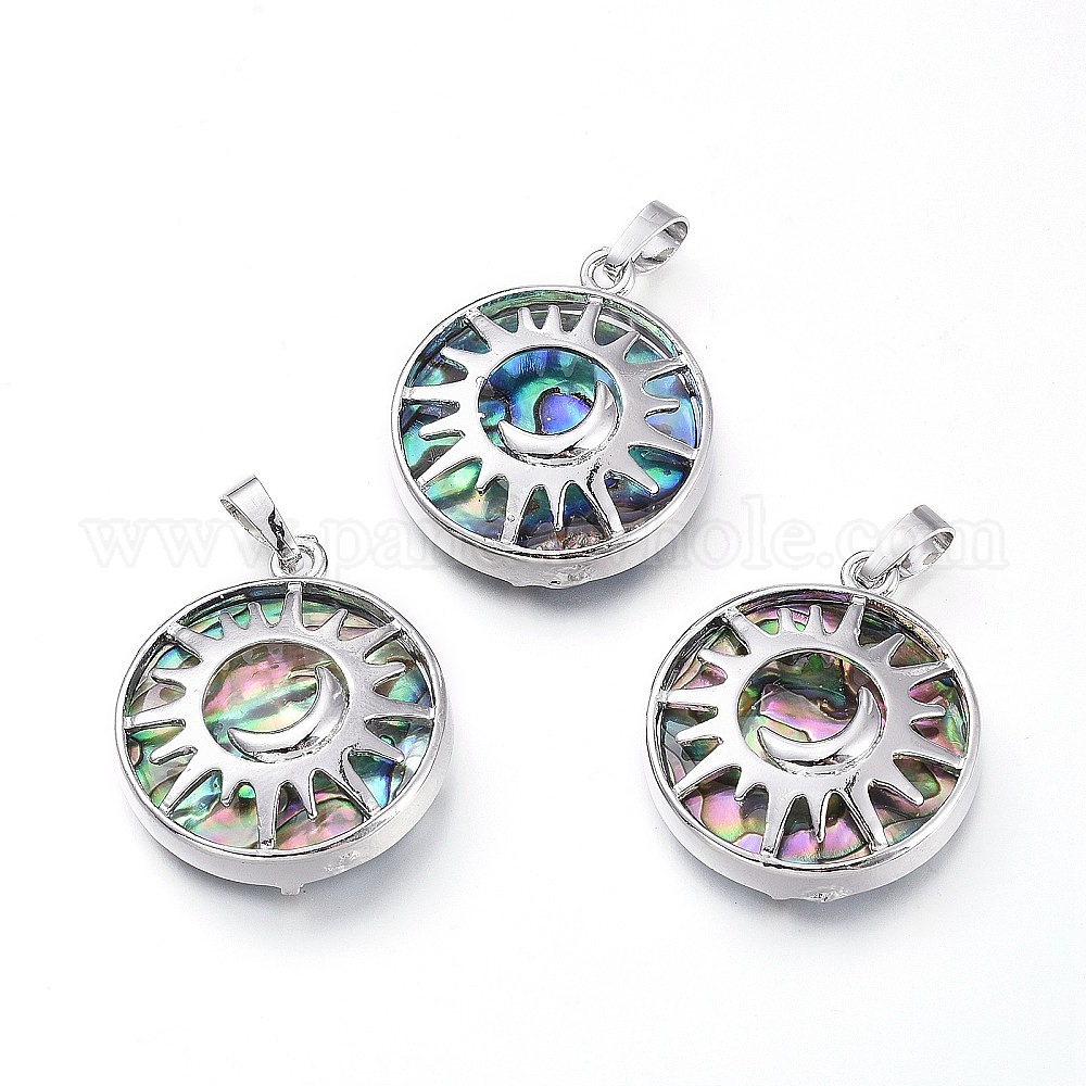 Подвески из натурального ушка / ракушки, с латунной фурнитурой , плоский круг с луной и солнцем