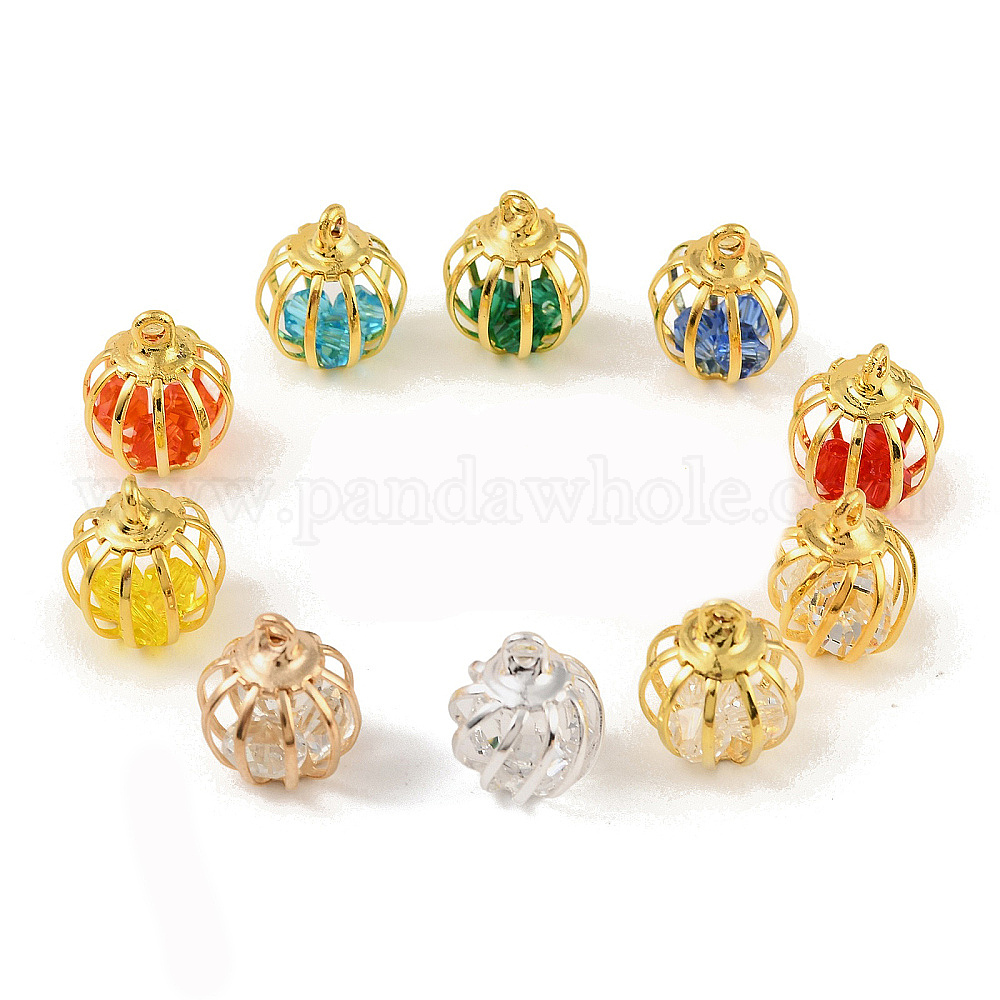• Золотой Подвески в виде клетки из железных и стеклянных бусин, круглые подвески, разноцветные, золотые, 14x12x12 мм, отверстие : 1.5 мм