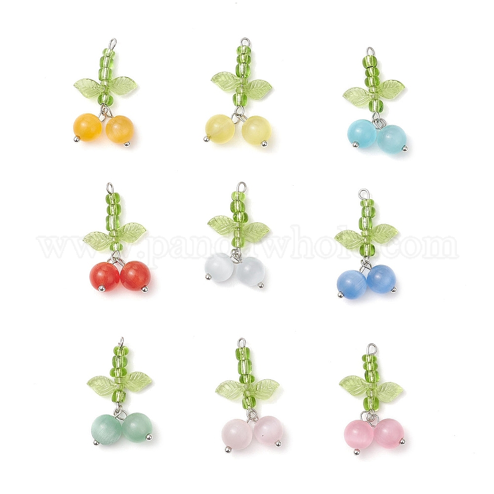 9шт. подвески кошачий глаз, вишня, с акриловым, стеклянным и платиновым соединительным кольцом
