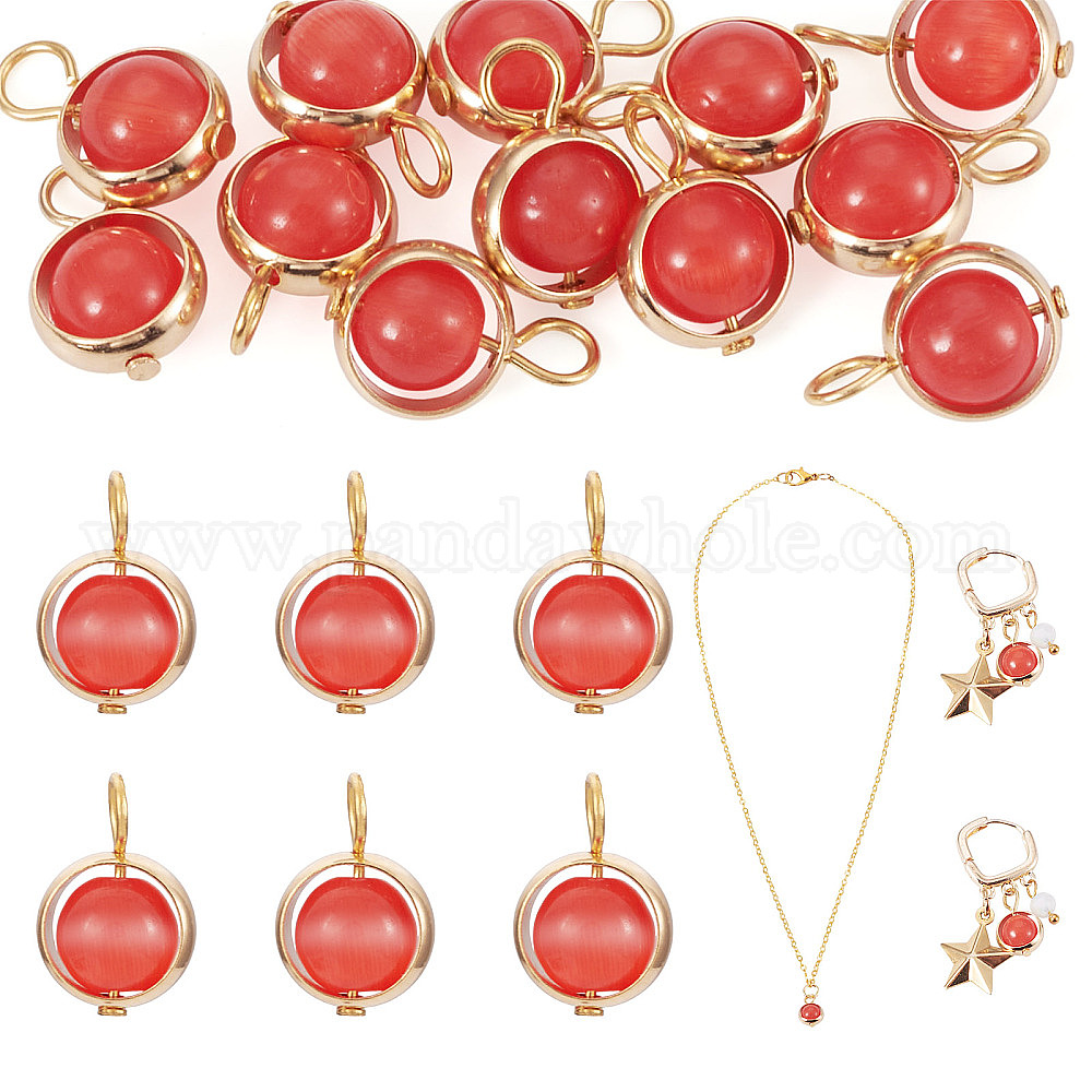 • Оранжево-Красный 12 шт. круглые подвески из латуни и стекла с имитацией кошачьего глаза, с 304 петлями из нержавеющей стали, золотые, оранжево-красный, 12.1 мм, отверстие : 2.2 мм