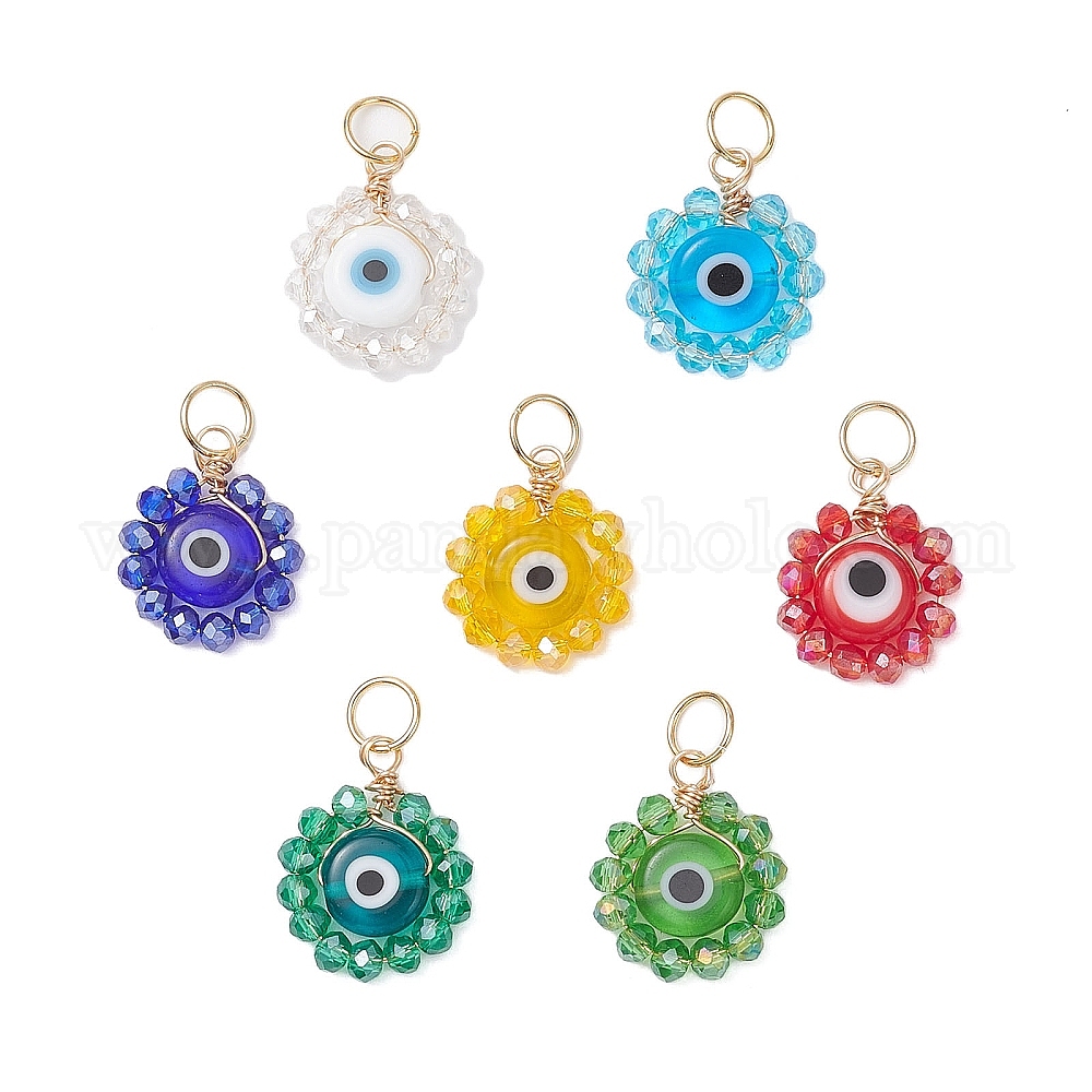 7 шт. 7 цветов подвески из стеклянных бусин ручной работы в технике лэмпворк, злые глаза, золотые, с 304 кольцами из нержавеющей стали
