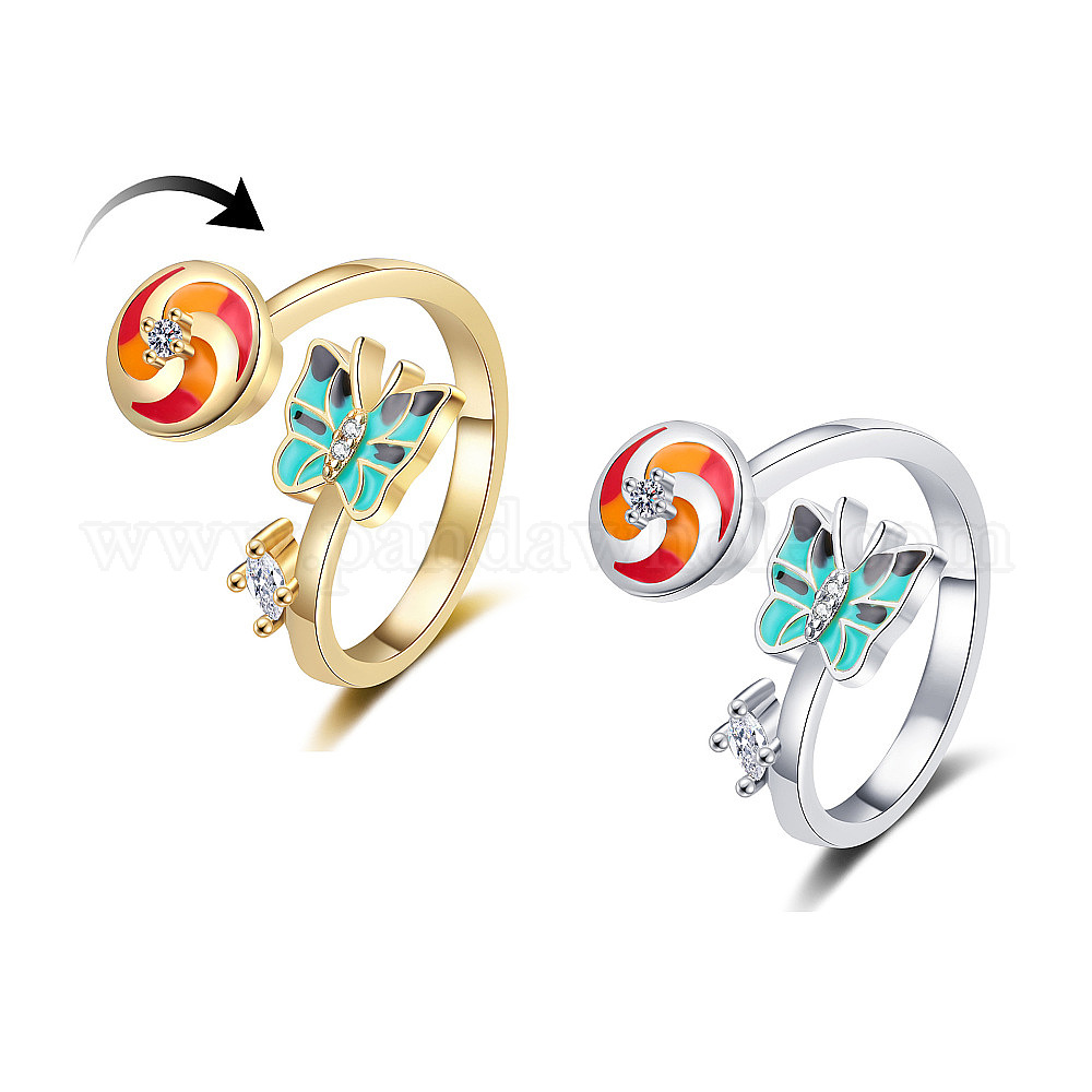 • Платина Вращающееся кольцо в виде мельницы и бабочки с цирконом и эмалью, стиль ins, открытые манжеты для указательных пальцев, подарок для подруги, платина, размер США 8 (18.1 мм)