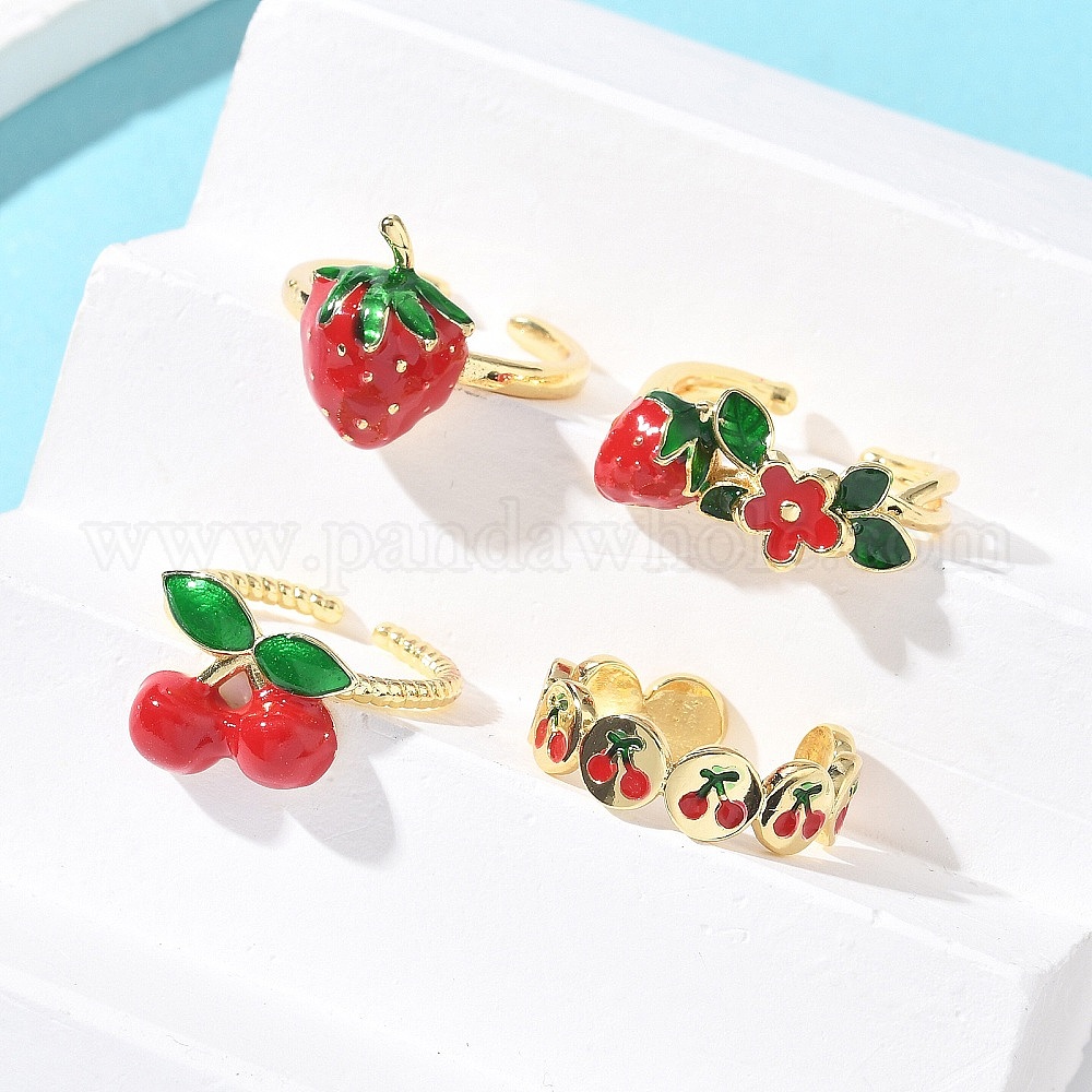 • Клубника Латунные эмалевые регулируемые манжеты для женщин, золотые, клубника, клубника: 15.5x11.5 мм, внутренний диаметр: регулируемый