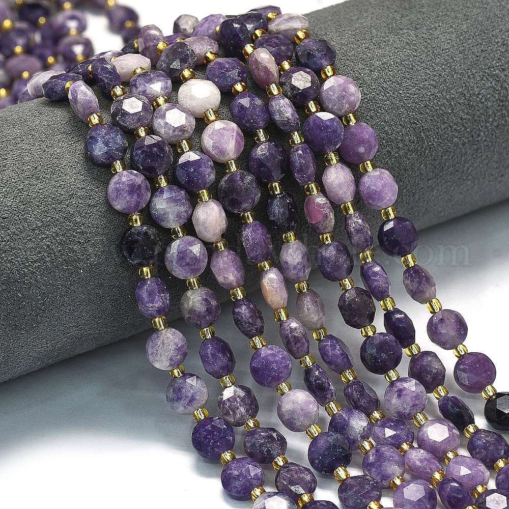 Натуральные лепидолитовые бусины, граненый шестиугольный разрез, плоско-круглые, с бисером