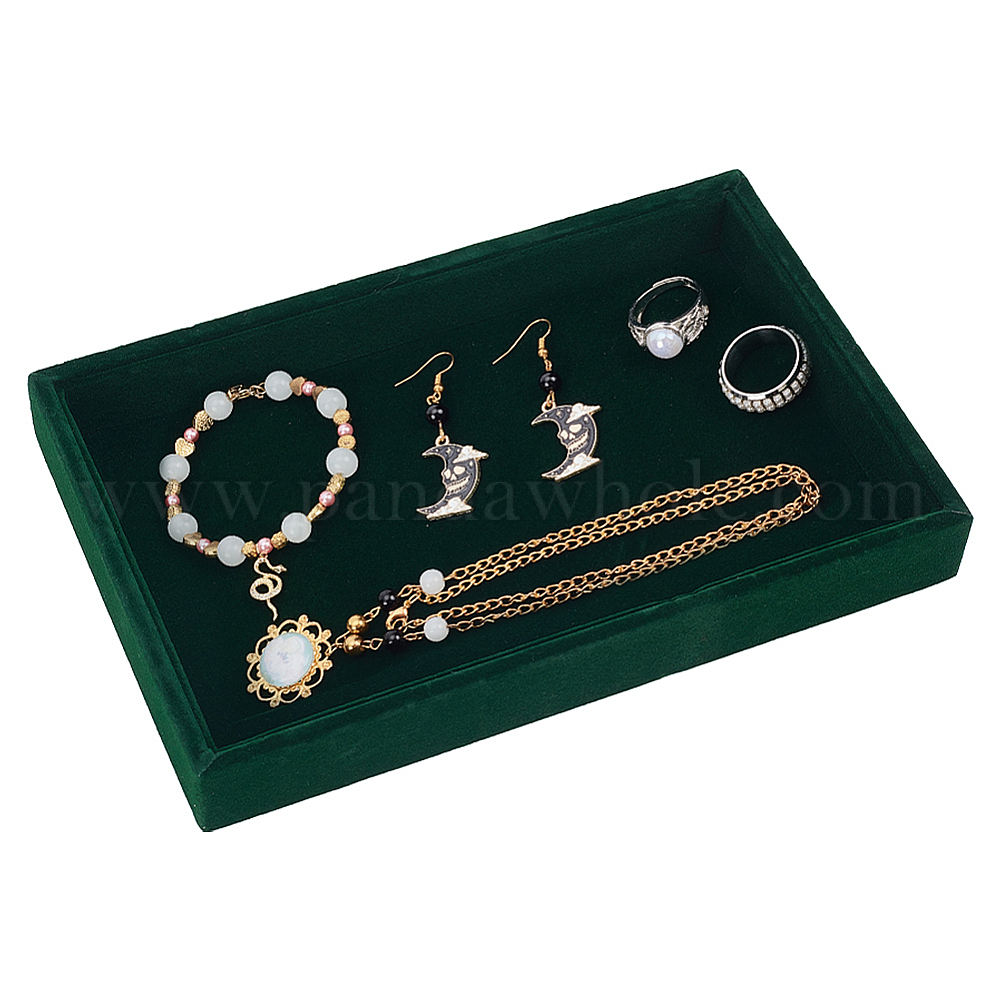 • Темно-Зеленый Прямоугольное дерево, покрытое бархатными подносами для ювелирных украшений, для колец, , Серьги, хранение браслетов, темно-зеленый, 22.5x14.5x2.9 см, Внутренний размер: 21x12.95x2.3 см