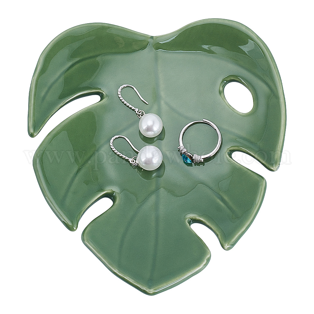 • Светло-зеленый Коричневый Поднос для украшений из фарфора, лист, оливковый, 140x125x23.5 мм