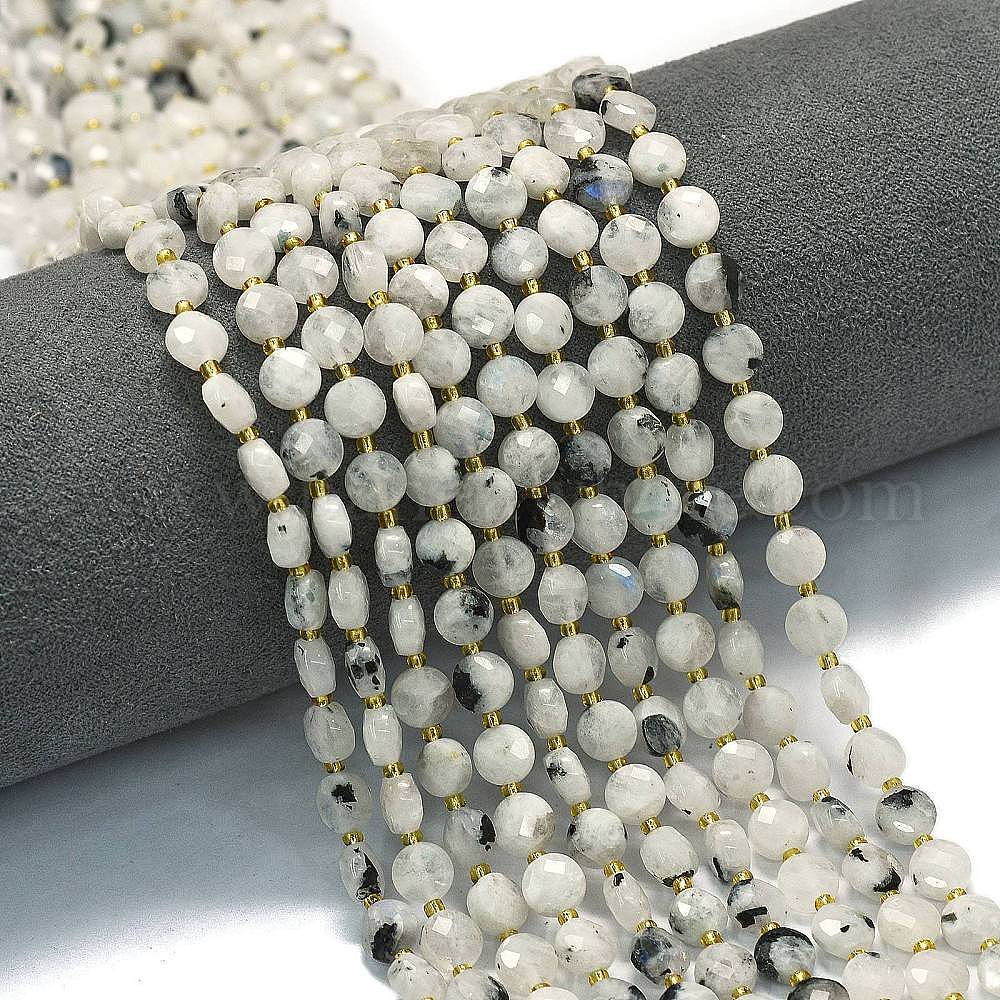 • Rainbow Moonstone Бусины из натурального радужного лунного камня, с бисером, граненый ромб, плоско-круглые, 6~6.5x4 мм, отверстие : 0.6 мм, около 51 шт / нитка, 15.43'' (39.2 см)