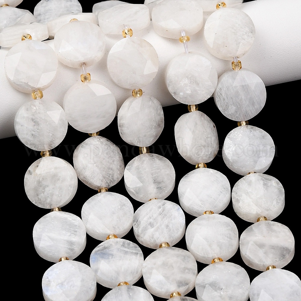 Бусины из натурального радужного лунного камня, плоско-круглые, граненый шестиугольный разрез, с бисером