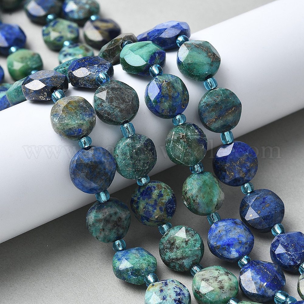 Натуральные бусы из хризоколлы и лазурита, плоско-круглые, граненый шестиугольный разрез, с бисером