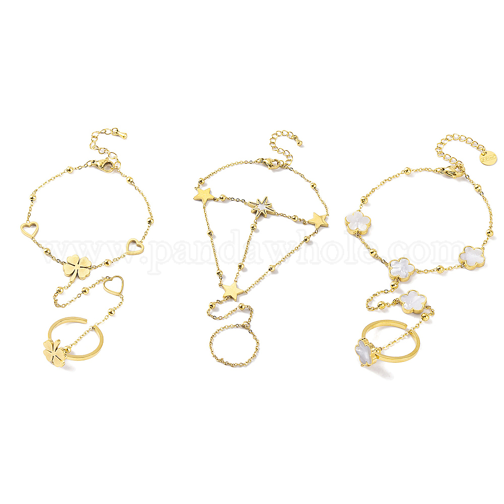 Ионное покрытие (IP) 304 браслеты-кольца из нержавеющей стали, браслет-цепочка из ракушек клевера/звезды/цветка с кольцами, золотые