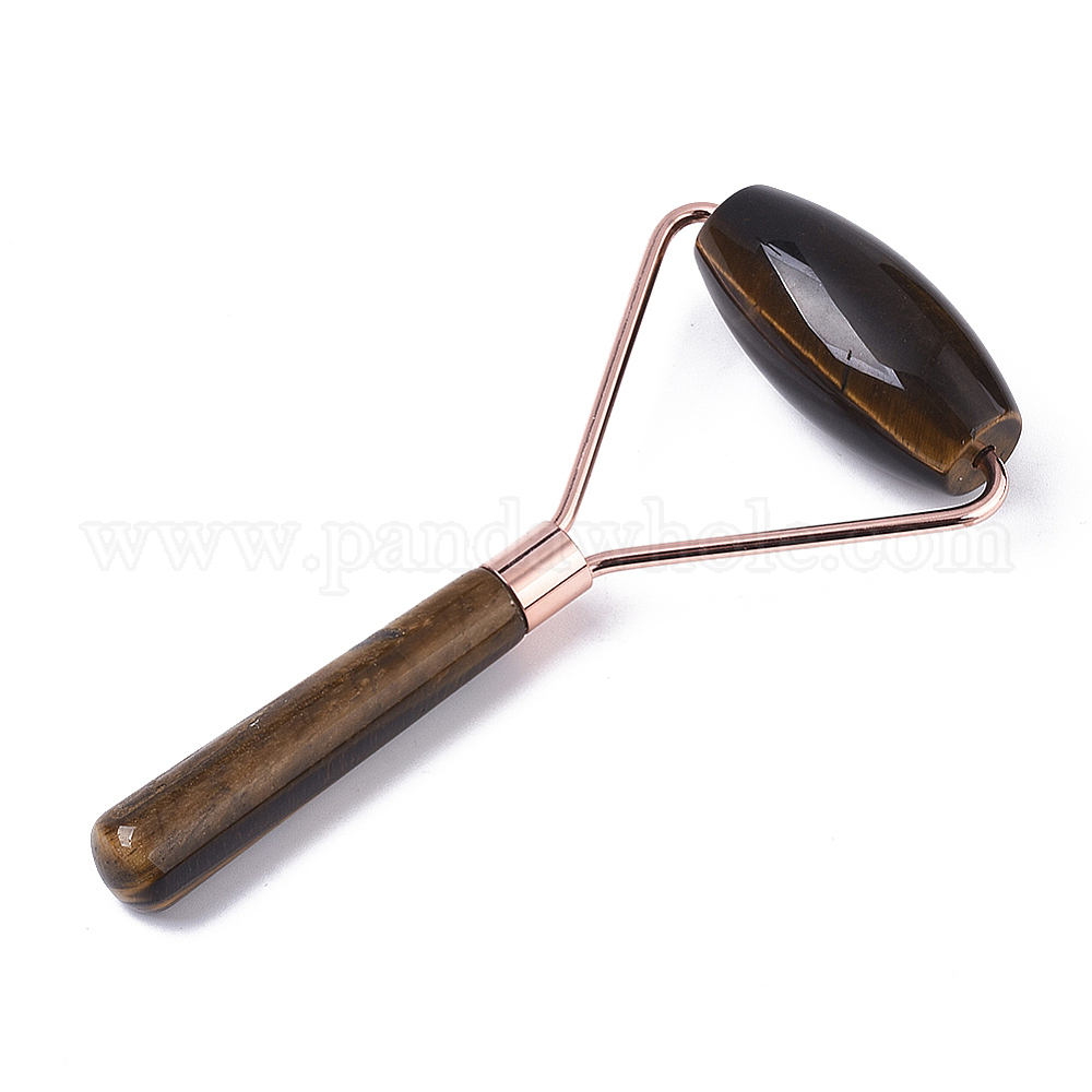 • Тигровый глаз Инструменты для массажа глазного тигра, лицевые ролики, с латунной фурнитурой , без покрытия, 14.2x5.9x2.5 см