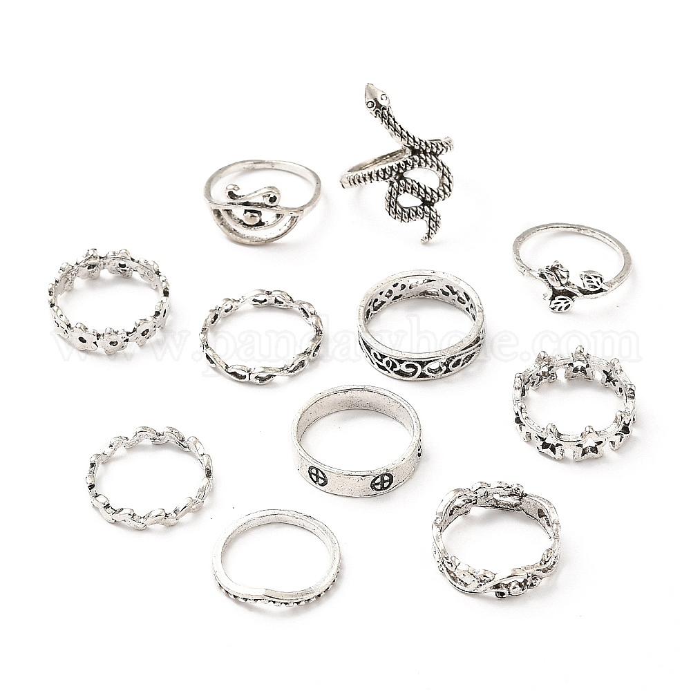 • Античное Серебро Комплекты колец из цинкового сплава, полый, цветок, лист, змея, роза, звезда, волна, античное серебро, 1~15.5 мм, внутренний диаметр: 16.7~18.1 мм, 11 шт / комплект
