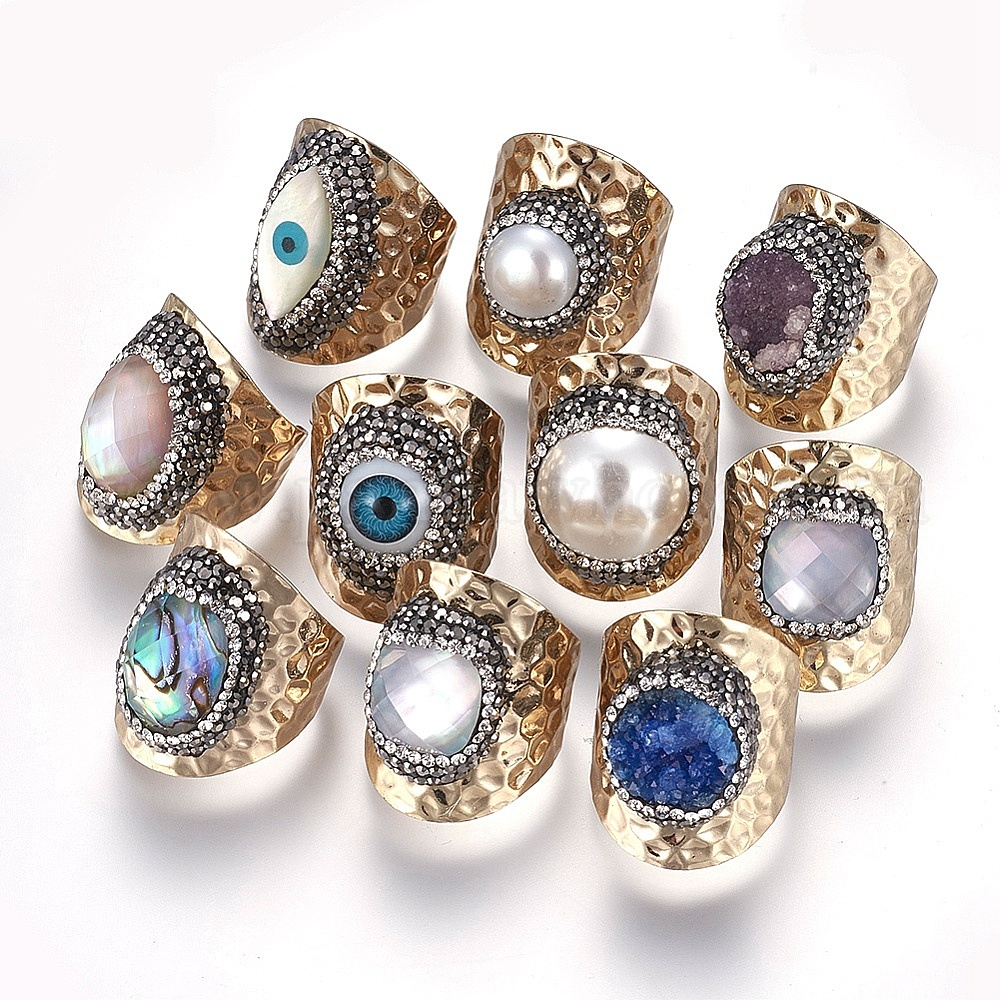 Кольца с манжетами из смешанного материала, открытые кольца, с полимерным глинистым горным хрусталем и железными находками
