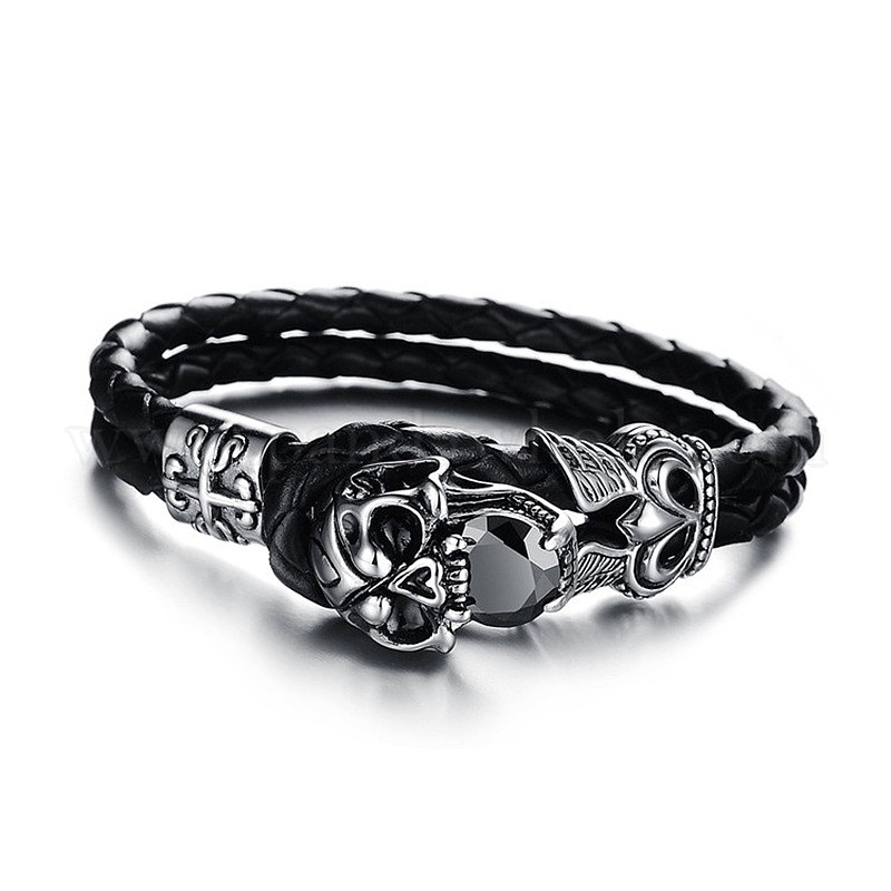 Двухслойный многорядный браслет из воловьей кожи, готический браслет с застежкой в виде черепа из кубического циркония для мужчин