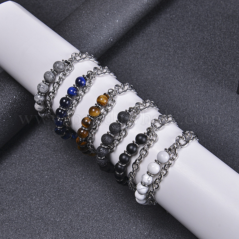 Мужской двухслойный браслет из нержавеющей стали 8мм с натуральными драгоценными камнями, 6.6~8.5 дюйм