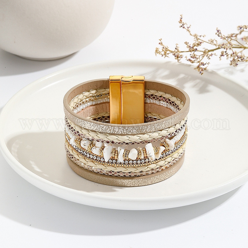 Кожаный браслет из нескольких нитей, с бисером из искусственной бирюзы и магнитной застежкой