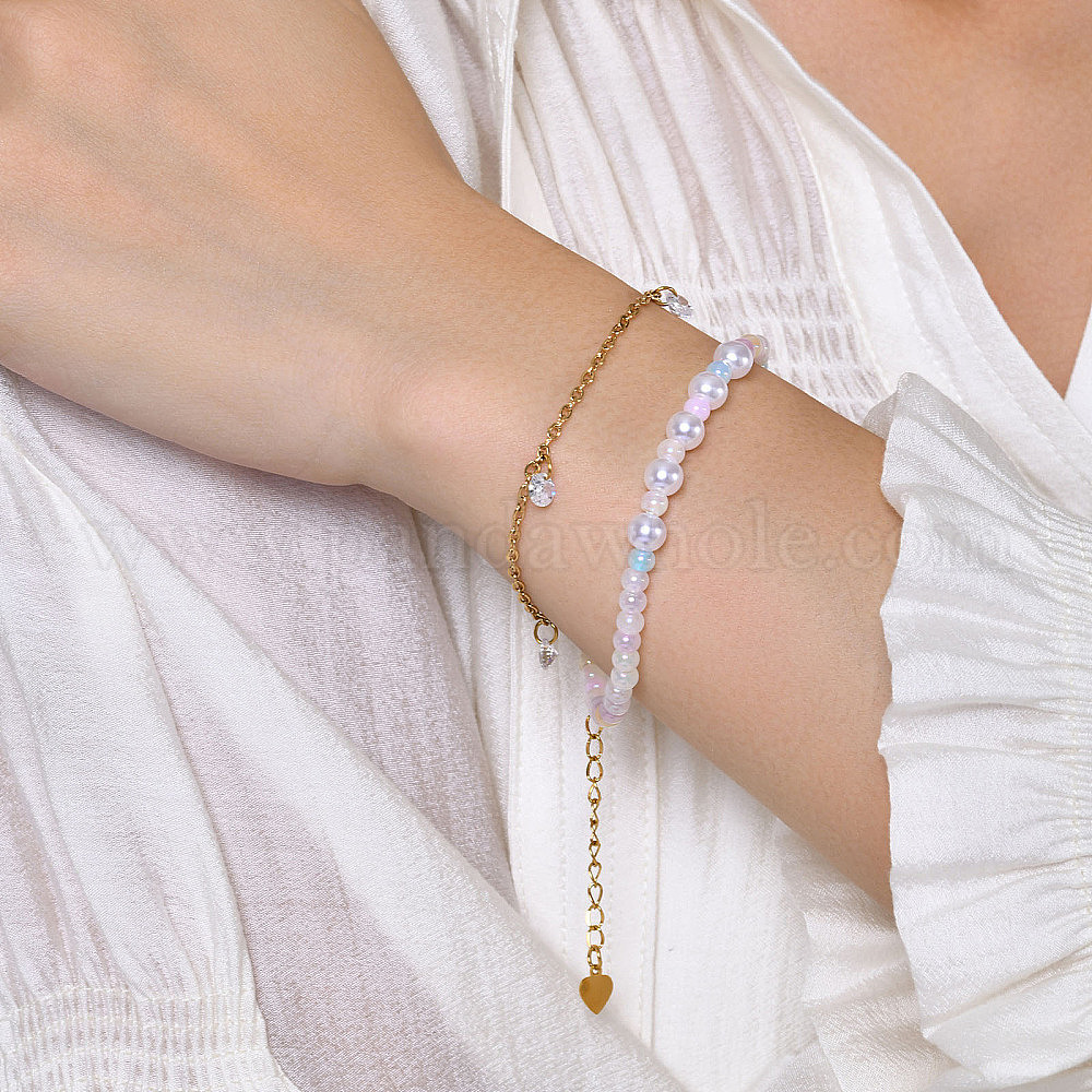Тросовая цепочка из нержавеющей стали с ионным покрытием (IP) и многонитевые браслеты из пластика с имитацией жемчуга, с фианитами для женщин (02T7Q1)