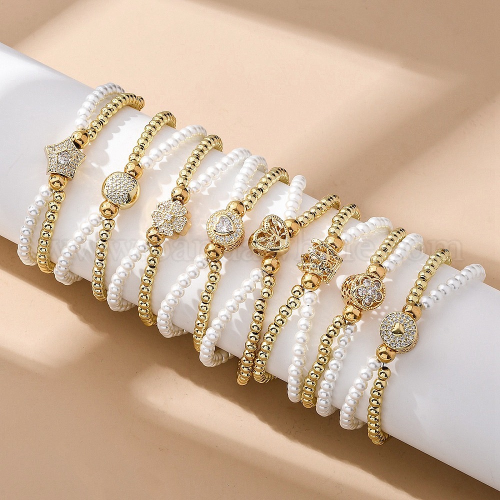 Латунь многожильных браслеты, браслеты со стразами для женщин, ионное покрытие (ip), с пластиковой имитацией жемчуга и 304 карабином из нержавеющей стали, реальный 18 k позолоченный