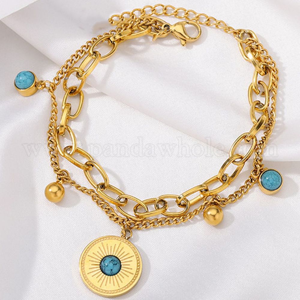 304 Браслеты из двух слоев с бусинами из искусственной бирюзы и нержавеющей стали, браслеты с подвесками для женщин, плоско-круглые