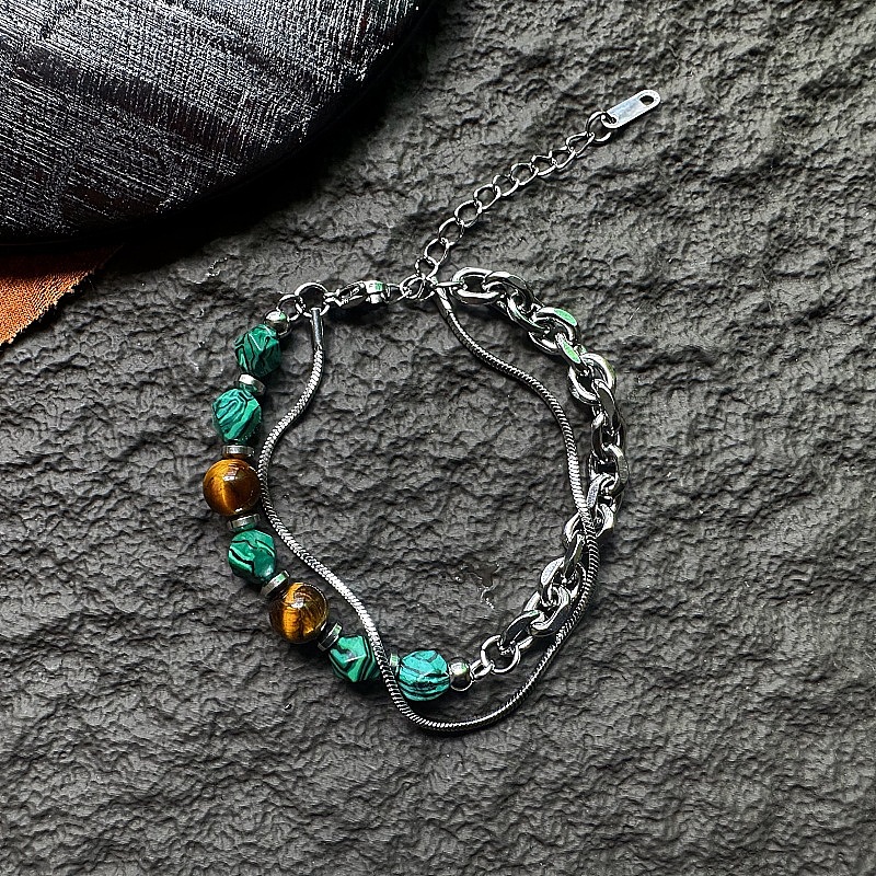 201 Браслеты из нержавеющей стали с двухслойной цепочкой и змеевидной цепочкой, Браслеты для мужчин из круглых бусин натурального тигрового глаза и синтетического малахита. (03A9AB)