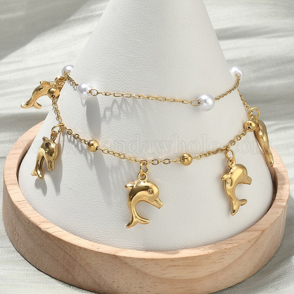 304 Браслеты из нержавеющей стали с двухслойной цепочкой в виде спутников., Браслеты с подвесками в виде дельфинов для женщин, с абс пластмассовой имитационной жемчужиной, ионное покрытие (ip), долговечный